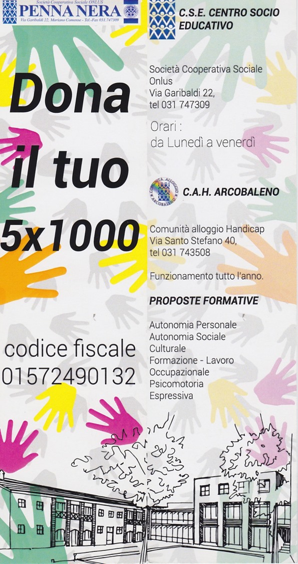 Negli anni il vostro supporto ci ha permesso di sviluppare nuovi progetti, aumentare le collaborazioni con il territorio e donare tanti sorrisi.Sostienici anche quest’anno donando il tuo 5XMILLE alla PENNA NERA, abbiamo ancora tanto da realizzare per garantire la continuità e il miglioramento dei progetti educativi in favore dei nostri ospiti.